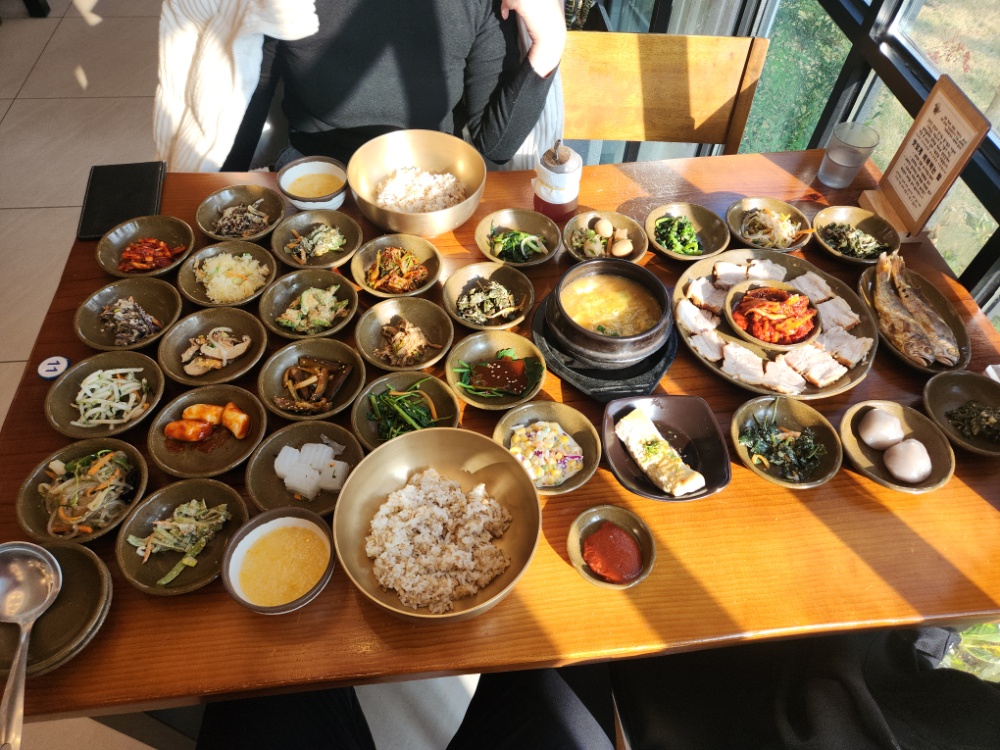 - 메인 요리의 품격 (수육 & 생선구이): 나물 정식이라고 메인이 소홀하지 않습니다. 잡내 없이 잘 삶아진 **수육(보쌈)**과 노릇하게 구워진 생선구이가 함께 제공되어 든든한 포만감을 선사합니다.